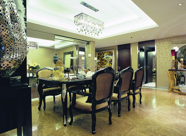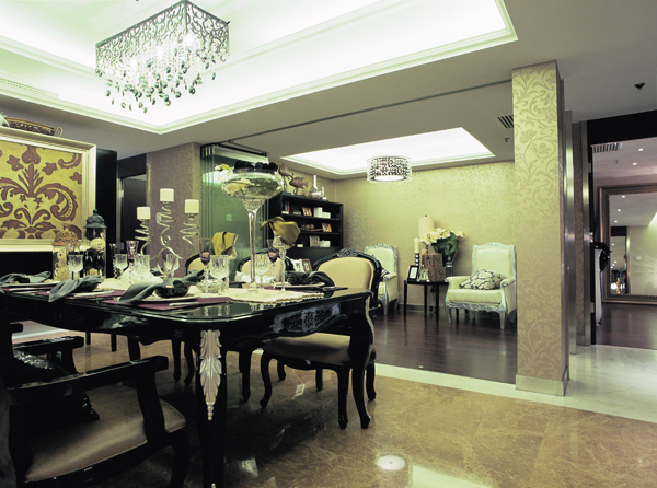 在設(shè)計(jì)上,墻面大面積的使用了古典歐式色彩的壁紙配合經(jīng)過提煉的歐式線條,使歐式不再是遙遠(yuǎn)的過去,而是鮮活時(shí)尚的品味象征。減掉了復(fù)雜的歐式護(hù)墻板使用了提煉過的石膏線勾勒出線框,把護(hù)墻板的形式簡(jiǎn)化到極致。