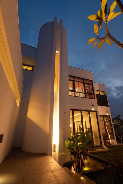 這個4500平方英尺的房子建在8000平方英尺的一個緩坡上降落。房子的方向是特殊的,因為它并不能面對服務道路,但有一個45度的傾斜。它能達到兩個目標:第一,寬度和建筑物的大小是優化;其次,它確保隱私的人。建筑結構保存雖然增加了一些微小的擴展。這房子被漆成白色,這樣一個能欣賞強壯的架構形式。黑暗的鋁框玻璃窗被安裝在眾議院。以補充現代形式、景觀建筑都保持清潔。蓄意使用戲劇性的Serralunga盆與Zamia紙板棕櫚成為焦點的花園。