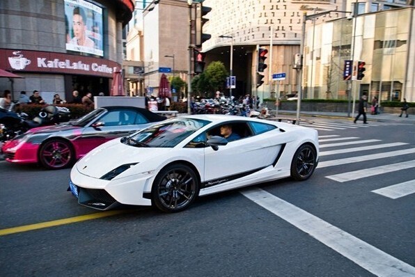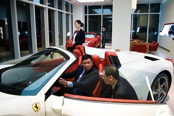 浦東世紀大道一間豪車展廳內(nèi),一位男士試駕報價450萬人民幣的法拉利458 Spider。