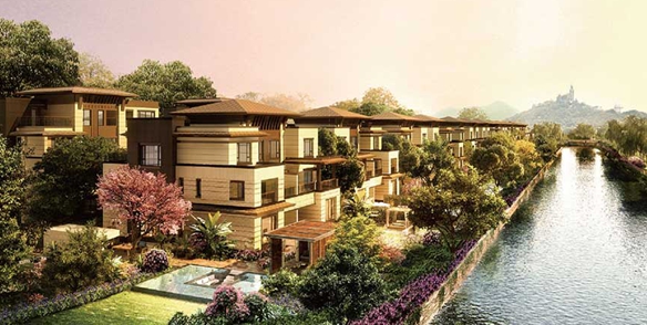 松江世茂佘山里別墅裝修設計:世茂佘山里項目具有新亞洲風格的聯排和雙拼別墅。整個別墅區占地面積9.4萬平方米,總共80棟,348戶,綠化率達40%。