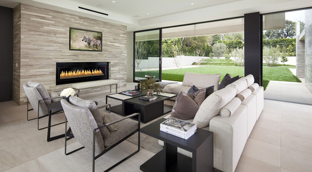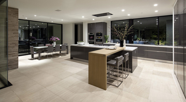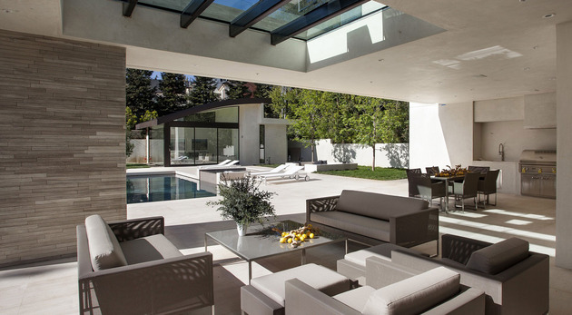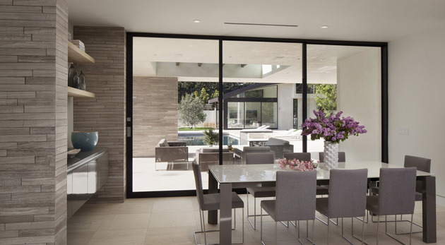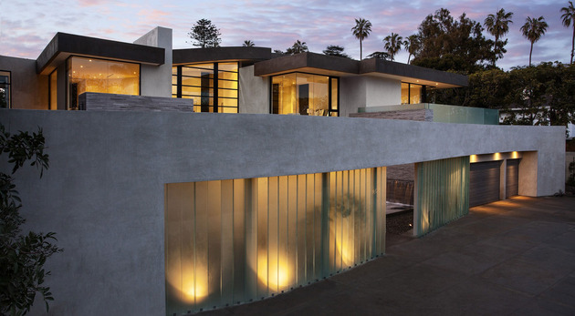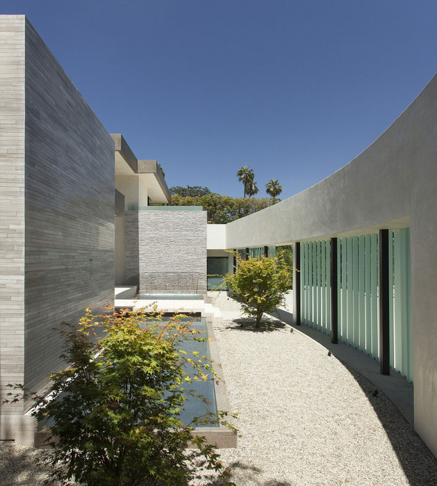 房子位于一條街道,為了減少汽車噪音影響,建筑師用高大的圍墻和大門將庭院與街道隔開,大門兩側(cè)是玻璃百葉,起到緩沖噪音的作用,同時(shí)不阻擋光線通過(guò)。此外,還設(shè)計(jì)了一條路和小橋,將大門和室內(nèi)連接。穿過(guò)院子時(shí),可以欣賞水景,也能聽(tīng)到瀑布?jí)Φ牧魉暎谷烁械椒浅7潘伞?br />